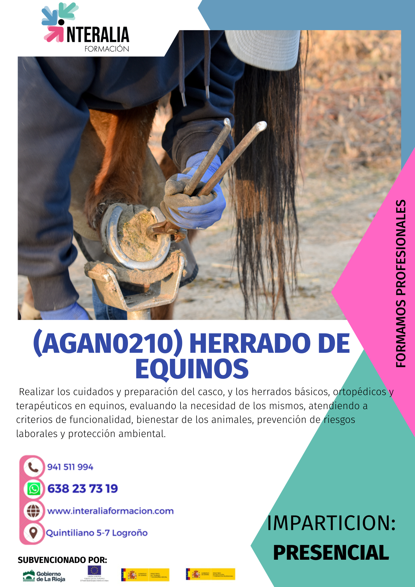 ¿Apasionado por los caballos? ¡Conviértete en un experto herrador! Este certificado te capacita para herrar caballos de forma profesional, lo que te abrirá las puertas a un mercado laboral en constante demanda: clínicas veterinarias equinas, centros ecuestres, ganaderías, herrerías, etc. ¡Forja tu futuro en el mundo del caballo!